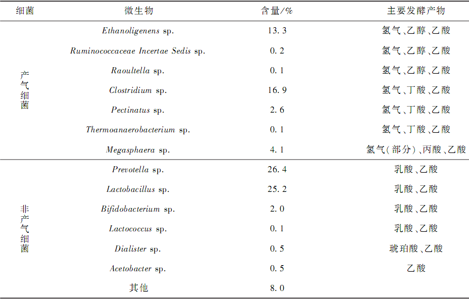 本實驗微生物群落分析的主要目的是初步了解酸化后系統中各種類型微生物的分布(在微生物分類過程中只鑒定到屬,未鑒定到種,因此只是一個大致的分類) 。 酸化后系統中典型的微生物在屬級別的組成和分布情況如表 2 所示。 總產氫微生物的比例之和占 37. 3% ,非產氫微生物比例之和占 54. 7% ,其他占8% 。 產氫微生物中,乙醇型產氫細菌(Ethanoligenens sp. 、Ruminococcaceae Incertae Sedis sp. 和 Raoultellasp. ) 、丁酸型發酵產氫細菌( Clostridium sp. 、Pectinatus sp. 和 Thermoanaerobacterium sp. )和丙酸型發酵產氫細菌(Megasphaera sp. )的比例分別為 13. 6% 、19. 6%和 4. 1% 。 非產氫細菌中,主要代謝產物為乙酸和乳酸的細菌( Prevotella sp. 、Lactobacillus sp. 、Bifidobacterium sp. 和 Lactococcus sp. )總共占了 53. 7% ,其中Prevotella sp. 占 26. 4% ,Lactobacillus sp. 占 25. 2% ,還檢測到 Dialister sp. 和 Acetobacter sp. 的存在。 產氫微生物中,乙醇型產氫細菌、丁酸型產氫細菌和丙酸型細菌共存,可以看出系統為混合酸發酵類型,與 2. 3 處酸化后的發酵類型保持一致。 從酸化后系統產氫微生物所占的比例和發酵類型上看,酸化后的系統并不適合以產氫為目的的厭氧發酵污水處理。