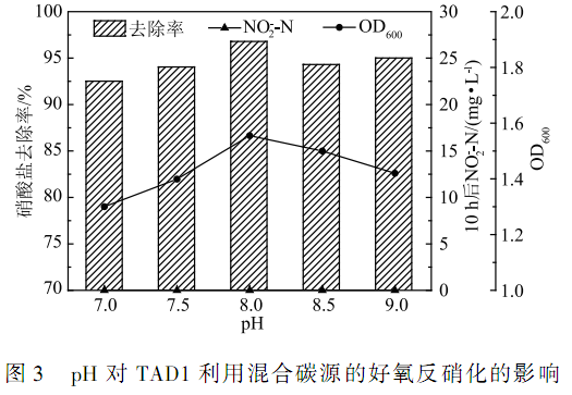 由圖 3 可看出:隨著初始 pH 的增加,硝酸鹽去除率先增加后下降,在 pH 為 8. 0 時(shí)達(dá)到最大值96. 79% 。 在初始 pH 為 7. 0 ~ 9. 0 時(shí)均沒有亞硝酸鹽的積累。 OD600的變化趨勢(shì)與硝酸鹽去除率的相一致,在 pH 為 8. 0 時(shí)達(dá)到最大值 1. 555。 因?yàn)樵赥AD1 利用玉米葉水解液的過程中,培養(yǎng)基的 pH 會(huì)先下降再上升,因此在初始 pH 為 8. 0 時(shí),更有利于TAD1 生長(zhǎng),從而達(dá)到更高的去除率。 值得注意的是,在 pH 為 7. 0 ~ 9. 0 時(shí),去除率均高于 92. 5% ,說明 pH 的下降沒有給好氧反硝化帶來顯著的負(fù)面影響。