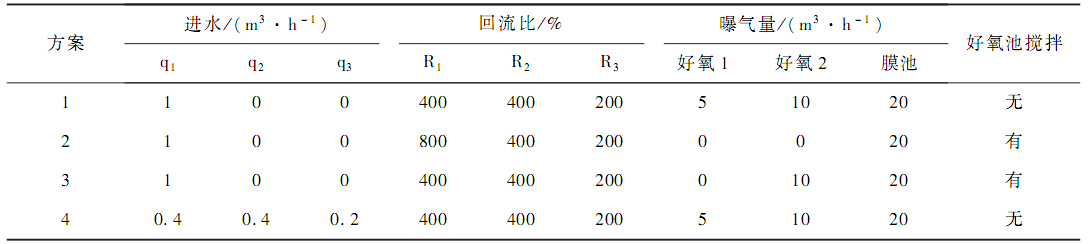本研究優選了 4 套實驗方案,其中方案 1 模擬昆明市第四污水處理廠處理工藝流程。 其他方案與方案 1 相比,主要調整如下:方案 2,完全停止好氧池曝氣,加大 R1 回流,主要考察膜池富余溶解氧利用替代曝氣的效果;方案 3,降低好氧池首段曝氣量,主要考察降低曝氣量的影響;方案 4,改變進水方式,考察多點進水運行工況的效果。 各方案運行的具體變量對比如表 2 所示。