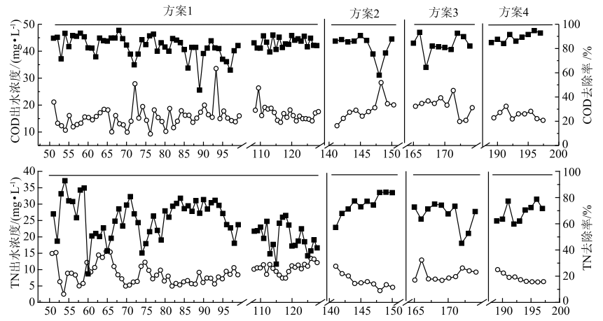 方案 3 降低曝氣量后,仍存在較高的 COD 和 NH3 -N 去除率,可能是存在兼型厭氧菌在低 DO 條件下利用有機碳源進行反硝化作用。 但同時,NH3 -N 要高于方案 2 和方案 3,TN 去除率不高,這是因為反硝化菌活性不高,亞硝酸還原酶的合成受到抑制,導致反硝化過程中亞硝酸鹽的積累,這也在孫家君等、周丹丹等的研究中也發現相似的規律。