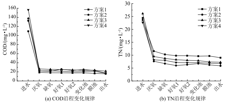 各方案在運行期間均達到了較好的 COD 去除效果,去除率分別為 86. 23% 、 87. 47% 、 84. 79% 、89. 65% 。 從沿程污染物濃度變化情況(圖 3)可知,由于受到生化降解及回流液稀釋的作用,各方案 COD濃度在厭氧池下降幅度較大,可達到 81. 28% 以上,后續處理單元對 COD 也有少量的去除作用。 改變運行參數后(方案 2、方案 3 及方案 4) ,各單元 COD 去除率均略有下降,但與對照組相比差異并不顯著,不影響出水達標(均低于 30 mg·L - 1) 。 這表明,不同供氧方式及進水方式對 COD 處理效果的影響不大。 當改變供氧方式時(方案 2 或方案 3)好氧池溶解氧均值低于 0. 25 mg·L - 1,與厭氧池、缺氧池 DO 梯度變小, MBR 工藝中有機物的去除主要通過生化降解,而該套工藝中由于膜系統的存在具有極好的泥水分離效果,污泥濃度高(5 ~ 8 g·L - 1) ,保證了 COD 的良好去除率。 當采用多點進水時(方案 4) ,對碳源進行了重新分配,但未見缺氧池與變化池 COD 值出現明顯上升,主要原因是污泥濃度較高,有機物在反應器前段快速被消耗,而本次實驗的采樣點則位于處理構筑物的末端。