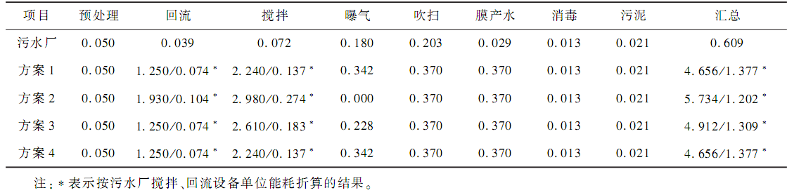 污水處理過程中的能耗主要是指電耗,據研究其中鼓風機、泵等設備的電耗通常占到總體直接能耗的60% ~ 90% 。 中試裝置預處理、出水消毒系統、污泥系統的耗電量參考污水廠的耗電量,由于中試裝置的曝氣設備直接接自昆明市第四污水處理廠的曝氣鼓風機,因此采用曝氣流量占鼓風機總流量的百分比來估算耗電量。 中試實驗用到的其他用電設備主要有:單相潛水泵(0. 75 kW,0. 37 kW) ,離心泵(0. 37kW,僅供出水、反沖洗用) ,為了在相同標準下比較,這些設備均按污水廠的能耗水平分別進行了折算,具體見表 4。