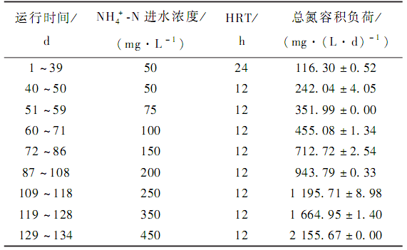 表 1 和表2 分別為反應(yīng)器 R1 和 R2 的運(yùn)行操作過(guò)程。 2 反應(yīng)器初始進(jìn)水 NH +4 -N 濃度均設(shè)在50 mg·L - 1,各階段穩(wěn)定后提高進(jìn)水基質(zhì)濃度,最終 NH +4 -N 的進(jìn)水濃度為 450 mg·L - 1,2 反應(yīng)器進(jìn)水 NH +4 -N 和NO -2 -N 的比例一直控制在 1 ∶ 1. 32,除去初始的污泥馴化適應(yīng)階段,水力停留時(shí)間 HRT 均保持在 12 h。