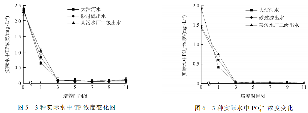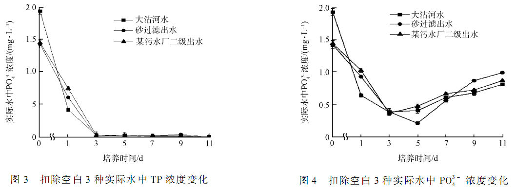 實驗條件為室內(nèi)模擬自然環(huán)境,自然光強范圍為 8 000 ~ 12 000 lx,光照時間約 10 h,溫度為 20 ~25 ℃,藻量(濕重)為 2 g·L - 1,每種實際水設置 3 個平行樣,每樣 800 mL,經(jīng) 0. 45 μm 濾膜過濾。 具體操作:稱取經(jīng)饑餓培養(yǎng) 48 h 新鮮剛毛藻 2 g,加入過濾后的實際水樣中。 置于自然陽光環(huán)境下培養(yǎng) 11 d,每隔 48 h 取一次樣。 由于剛毛藻對實際水的處理是為了應用于除磷工程實踐,因此本實驗以 TP 和 PO3 -4 作為測定指標。 實驗中以無藻組為空白進行對照。