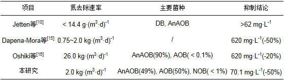 采用批次實驗研究磷酸鹽對厭氧氨氧化活性影響的研究中, Jetten等研究表明, 當磷酸鹽濃度小于31 mg·L-1(1 mmol·L-1)時對厭氧氨氧化污泥活性沒有明顯的抑制作用, 而當磷酸鹽濃度大于62 mg·L-1(2 mmol·L-1)厭氧氨氧化污泥活性開始受到影響. Dapena-Mora等研究表明磷酸鹽對厭氧氨氧化污泥的半抑制濃度在620 mg·L-1(20 mmol·L-1)左右. Oshiki等研究表明620 mg·L-1(20 mmol·L-1)的磷酸鹽濃度對厭氧氨氧化污泥活性只產(chǎn)生20%的抑制.三者不同的研究成果與本研究存在差異, 分析原因可能與接種污泥的活性、細胞濃度有關(guān)(表 3).