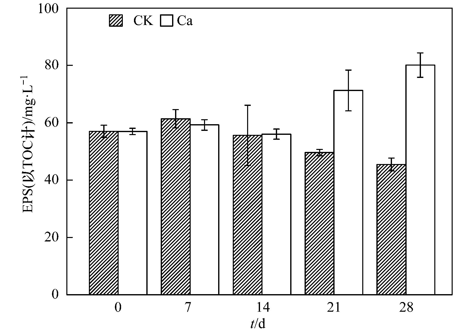前期實驗, 在進水中外源添加不同質量濃度Ca2+(0、30、50、100、150、200 mg·L-1), 當Ca2+添加量為100~200 mg·L-1時, 明顯改善了活性污泥沉降性能和污染物去除性能, 因此本研究中外源Ca2+添加量設置為150 mg·L-1(在圖中以Ca表示), 同時以進水中不添加Ca2+(0 mg·L-1)的SBR作為對照(以CK表示), 研究外源添加Ca2+對活性污泥啟動期污泥性能及EPS產生的動態影響.