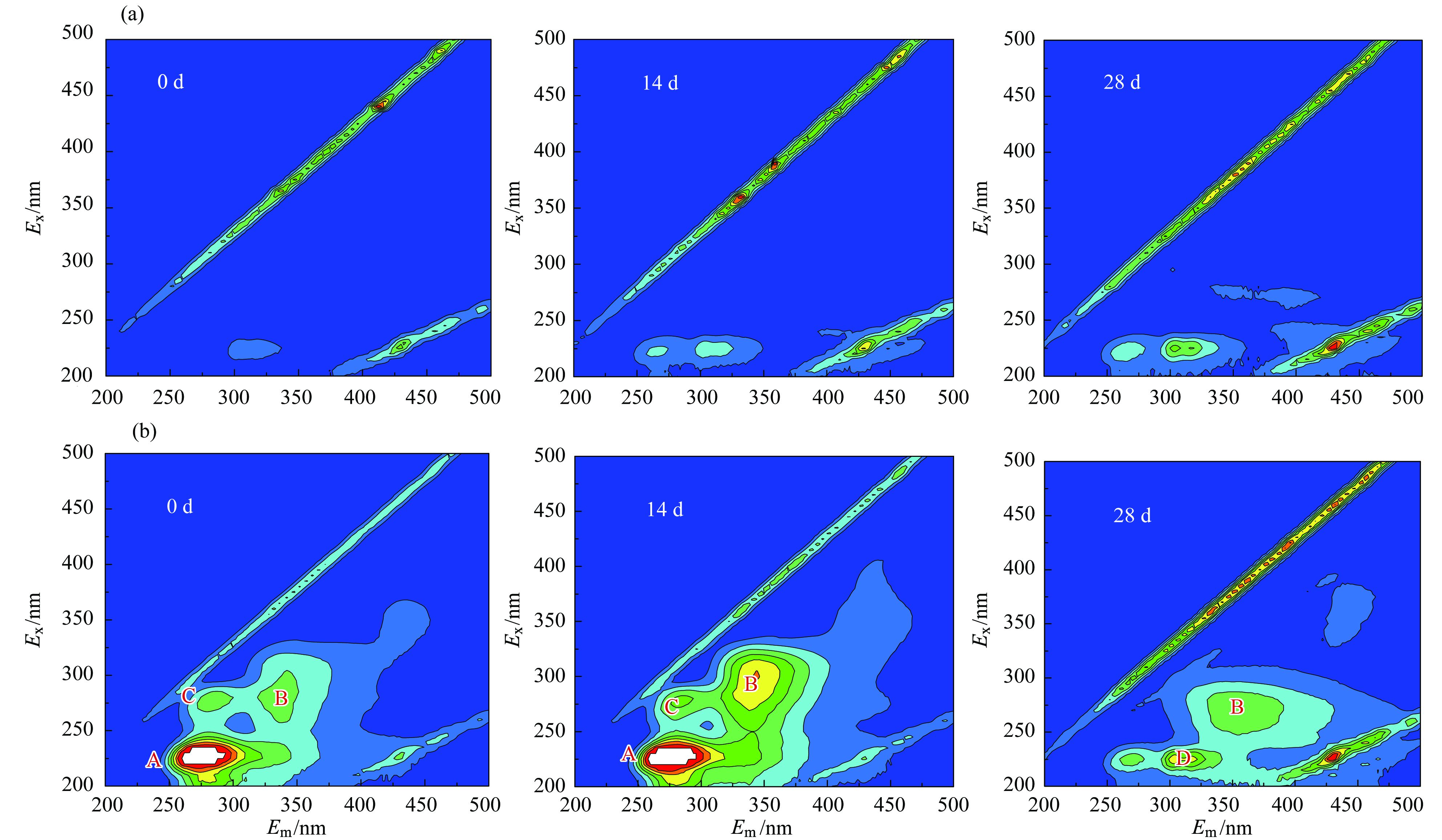 EPS的三維熒光光譜(three-dimensional excitation emission matrix fluorescence spectroscopy, 3D-EEM)采用熒光分光度計(LS-55, Perkin-Elmer Co., USA)測定.使用氙弧燈為激發光源, 激發波長Ex為200~400 nm, 發射掃描波長Em為280~500 nm; 激發與發射狹縫寬度均為5 nm, 激發波長掃描間隔為10 nm, 掃描速度為1 200 nm·min-1; Origin 8.0軟件進行數據分析.