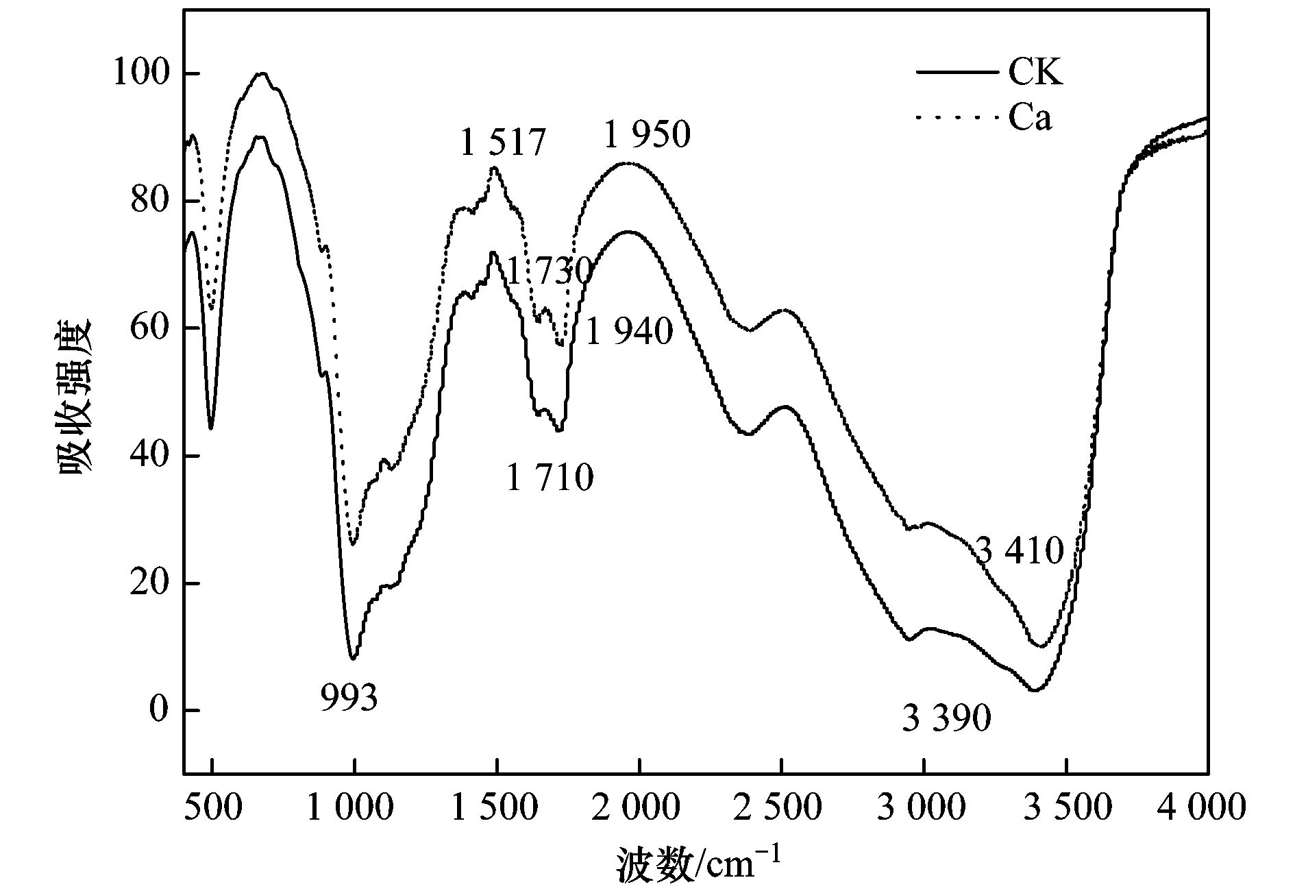 3D-EEM被認為是一種選擇性高、靈敏度好的光譜技術, 而且其所需樣品量少, 不破壞被測物質結構, 廣泛應用于EPS組分、官能團鑒定.進水中添加外源Ca2+與不添加Ca2+活性污泥EPS的三維熒光光譜見圖 4.進水主要成分為葡萄糖, 乙酸鈉和無機鹽類, 這些物質均不產生熒光, 因此三維熒光光譜檢測到的物質來源于EPS產物.在SBR啟動期, 活性污泥三維熒光光譜中具有4個熒光峰, A峰(Ex/Em=225~230/250~343 nm), B峰(Ex/Em=250~300/340~350 nm), C峰(Ex/Em=250~280/280~300 nm), D峰(Ex/Em=200~250/250~300 nm), 這些峰均屬于芳香族類蛋白質, 其中, D峰為酪氨酸.本實驗采用陽離子交換樹脂作為EPS的提取劑, 腐殖酸及富里酸類化合物沒有在三維熒光光譜中檢測到, 這可能是陽離子交換樹脂對EPS中腐殖酸類物質提取效率較差的緣故. EPS組分測定結果顯示進水中含Ca2+的活性污泥EPS中總蛋白質含量較CK反應器中活性污泥EPS總蛋白質含量低, 但從3D-EEM光譜圖中, 與對照反應器相比, 外源加入Ca2+活性污泥EPS中芳香族類蛋白質更多, 酪氨酸具有穩定長鏈環狀結構, 可以穩定污泥絮體. Sheng等通過外源加入不同濃度Ca2+, 發現Ca2+對好氧污泥及厭氧污泥EPS的三維熒光圖譜、峰強度和峰位置影響較小, Hg2+對污泥3D-EEM圖譜影響較大, 雖然圖譜中峰位置沒有發生明顯變化, 但峰強度隨著Hg2+濃度的增加而顯著降低, Cu2+也會有相同的影響.