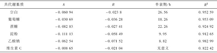 圖5 中各共代謝基質(zhì)擬合參數(shù)由數(shù)據(jù)處理軟件擬合得到,擬合曲線如表2 所示,擬合方程可以表示為Y = A + BX,擬合相關(guān)系數(shù)高則滿足一級(jí)動(dòng)力學(xué)方程lnC = lnC0 - Kt,此時(shí)- B 代表速率常數(shù)K,A 為截距,半衰期T1 / 2 = ln2 / K。