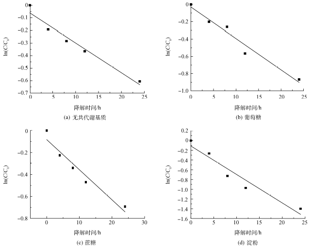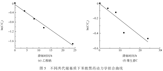 不同共代謝基質(zhì)下動(dòng)力學(xué)模型的建立可通過對(duì)濃度和時(shí)間的關(guān)系曲線進(jìn)行擬合,根據(jù)苯胺黑藥在投加比為2 ∶ 1 條件下所有降解效率均較高,本實(shí)驗(yàn)選取苯胺黑藥濃度150 mg·L - 1 ,共代謝基質(zhì)濃度為300 mg·L - 1 ,測(cè)得0、4、8、12、24 h 苯胺黑藥出水濃度,以出水濃度C 與初始苯胺黑藥濃度C0 比值的自然對(duì)數(shù)ln(C / C0 )作為縱坐標(biāo),降解時(shí)間為橫坐標(biāo),建立不同共代謝基質(zhì)的動(dòng)力學(xué)反應(yīng)模型。見圖5。