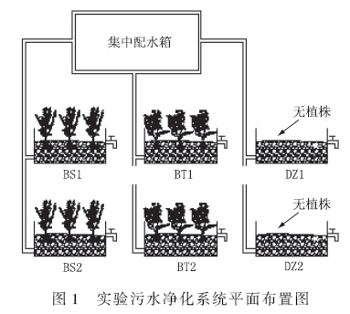 實(shí)驗(yàn)裝置于2015 年8 月建成,地點(diǎn)位于某大學(xué)污水處理廠一大棚內(nèi),實(shí)驗(yàn)期間氣溫約為(25 ± 5)℃ ,濕度為65% ~ 85% 。實(shí)驗(yàn)根據(jù)平行對(duì)照原則,共設(shè)計(jì)2 組平行實(shí)驗(yàn),每組包含3 個(gè)礫石基質(zhì)凈化系統(tǒng),分別為北水苦荬組(BS)、巴天酸模組(BT)和空白對(duì)照組(DZ)。實(shí)驗(yàn)系統(tǒng)采用塑料無(wú)土栽培箱制成,每個(gè)栽培箱長(zhǎng)、寬、高分別為0. 75 m × 0. 54 m ×0. 42 m,采用8 ~ 20 mm 的礫石基質(zhì)進(jìn)行填充,并在上面栽種植物,作為污水處理的主要構(gòu)筑物。其中,BS1 和BS2 上栽種北水苦荬,BT1 和BT2 上栽種巴天酸模,DZ1 和DZ2 為對(duì)照組,不栽種植物。系統(tǒng)頂端設(shè)有集中配水箱,用于初慮污水和向各濕地單元中進(jìn)水。污水由系統(tǒng)側(cè)壁下端進(jìn)水口連續(xù)流入,從系統(tǒng)另一側(cè)壁上端出水口連續(xù)流出。實(shí)驗(yàn)裝置如圖1所示。