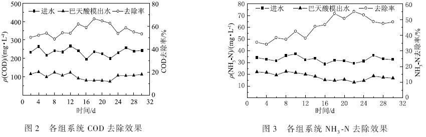 由圖2 可以看出,在整個(gè)實(shí)驗(yàn)周期內(nèi),系統(tǒng)進(jìn)水COD 濃度均值為234. 2 mg·L - 1 ,空白對(duì)照組、北水苦荬組和巴天酸模組出水COD 濃度均值分別為112. 4、103. 9、102. 1 mg·L - 1 ,平均去除率分別為52. 1% 、55. 8% 、56. 6% 。3 組實(shí)驗(yàn)系統(tǒng)COD 去除率整體趨勢(shì)均是前期較為平穩(wěn),中期上升,后期下降,且COD 去除率均在實(shí)驗(yàn)中后期達(dá)到了最大值,最終北水苦荬組和巴天酸模組COD 平均去除率優(yōu)于空白組5%左右。