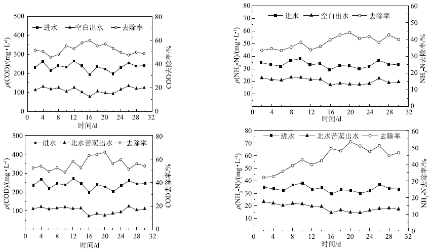選取馴化好的北水苦荬和巴天酸模各16 株,分別移栽至BT1 、BT2 和BS1 、BS2 中,每組系統(tǒng)各栽種8株,對(duì)照組DZ1 、DZ2 不栽種植物。為保證種植植株的適應(yīng)和存活,同時(shí)結(jié)合前期實(shí)驗(yàn)研究和相關(guān)計(jì)算結(jié)果,在植物栽種后,選擇該系統(tǒng)在水力負(fù)荷為0. 216 m3 ·(m2 ·d) - 1 的條件下連續(xù)運(yùn)行1 周進(jìn)行植株適應(yīng)性馴化,待系統(tǒng)中植物成活并生長(zhǎng)穩(wěn)定后,再連續(xù)運(yùn)行30 d,期間每間隔2 d 采樣一次,分析各組系統(tǒng)污水中COD、NH3 - N、TN 和TP 的去除效果。實(shí)驗(yàn)過(guò)程中水的蒸發(fā)作用損失水量通過(guò)補(bǔ)充蒸餾水以保持體積不變,將大棚兩側(cè)塑料膜卷起以保證光照充足和整個(gè)大棚的空氣流通,盡量避免實(shí)驗(yàn)環(huán)境與外界環(huán)境差異過(guò)大。