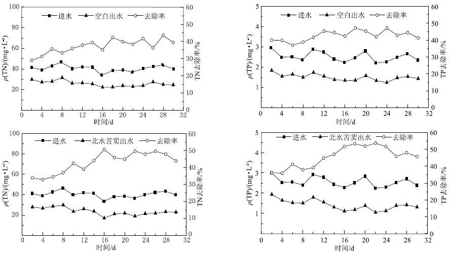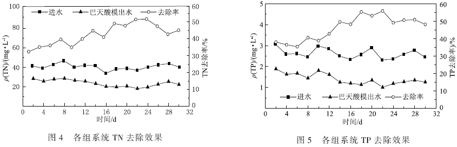 由圖4 可以看出:3 組實(shí)驗(yàn)系統(tǒng)在運(yùn)行前期對(duì)TN 的去除率均較低,平均去除率維持在35% 左右;但到實(shí)驗(yàn)中期,北水苦荬組和巴天酸模組對(duì)TN 的去除率開(kāi)始明顯上升,平均去除率可以達(dá)到46% 以上,而到后期TN 去除率則出現(xiàn)了小幅減小。空白對(duì)照組TN 去除率變化整體較為平穩(wěn),且效果低于實(shí)驗(yàn)組。