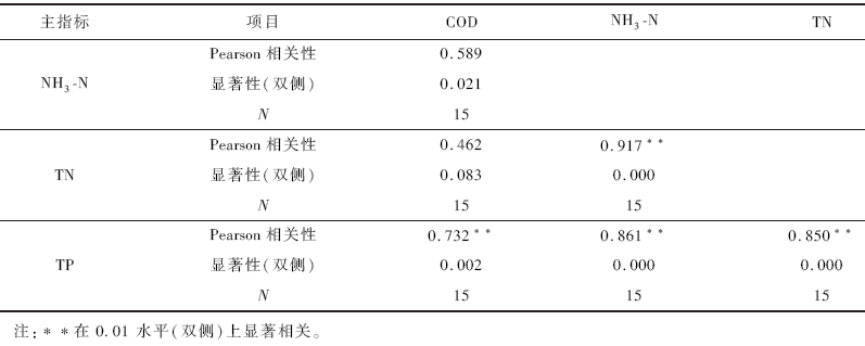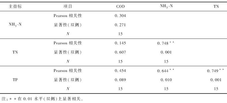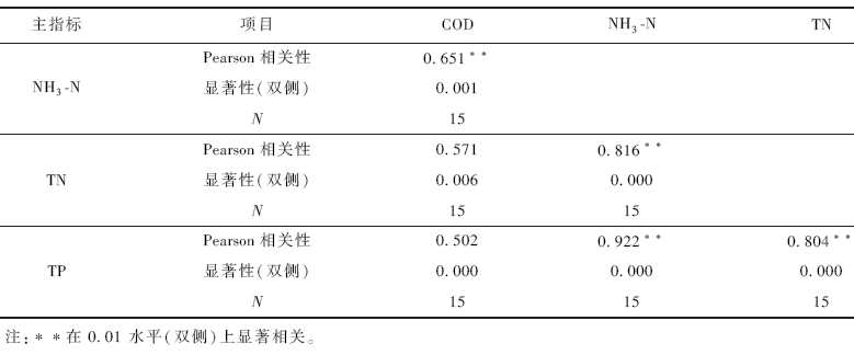 利用統(tǒng)計(jì)分析軟件SPSS 分別對(duì)各組系統(tǒng)中COD、NH3 -N、TN、TP 的去除率進(jìn)行Pearson 相關(guān)性分析,考察各濕地單元主指標(biāo)去除率之間的關(guān)系。
