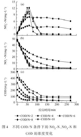 因此,如果從出水中COD 和TN 的濃度達到最小值的角度來看,最佳的COD/ N 比值為6。