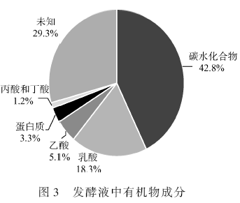 由于自由發酵過程中并不調節pH,有機酸的生成使得系統中的pH 在12 h 內就快速下降到3 左右,極低的pH 會抑制有機酸的生成;所以有機酸的產率在12 h 后變得比較緩慢(圖2),同時發酵液中也會有滯留大量的碳水化合物。由此可見自由發酵導致不完全的水解酸化過程,同時也使得發酵過程中的有機物的損耗量(生物氣的產生)不超過10% ,這與文獻中報道的50% 以上的基質損耗量相比較要小許多;因此,盡管有機酸不是自由發酵最主要的產物,但是它可以降低發酵基質氣體形式的損耗。圖3 顯示的是TS3 條件下的發酵液中的有機物成分,其中碳水化合物是最主要的成分,其次是乳酸和乙酸,其中還包含約29% 的未知有機物,可能是乙醇、長鏈脂肪酸或者一些更復雜的有機酸。乙酸、丙酸和丁酸等VFAs 的反硝化性能在前人的研究中已經得到了明確的驗證 ;乳酸也被認為是乙酸和丙酸產生的前驅物 ,也可以認為是一種良好的反硝化碳源,SAGW 等 的研究就驗證了乳酸鹽的反硝化性能;LEE等的研究表明,碳水化合物雖然是一種慢速降解碳源,但是它對反硝化菌群豐富度和代謝多樣性有強化作用;因此,發酵液既包含了快速降解的有機物(乙酸和乳酸),也包含了慢速降解的有機物(碳水化合物和蛋白質),它的反硝化性能需要得到驗證。在接下來的研究中,我們考察了TS3 條件下發酵液的反硝化性能。