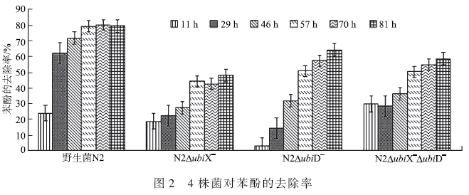 圖2 為4 菌株對苯酚的降解率。由圖2 可知,野生菌對苯酚的去除率普遍高于3 株突變菌,說明ubiX和ubiD 基因在N2 菌降解苯酚中起一定的作用。對單突變菌株,在46 h 時2 株單突變菌的苯酚降解率之和等于野生菌在此時段對苯酚的降解率,而在后期,單突變菌對苯酚的降解率升高,說明菌株對苯酚體系存在較長時間的生長延緩期,之后就會迅速生長并降解苯酚。就雙突變菌株來講,苯酚濃度400 mg·L - 1時其對苯酚存在一定的去除率,說明雖然ubiX 和ubiD 基因在N2 菌降解苯酚中起一定的作用,但N2 菌中還存在其他影響苯酚降解的基因。