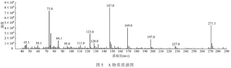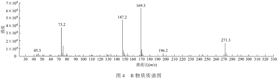 由圖5 可知,該物質的分子離子峰M + m / z = 286,主要的碎片離子峰有m / z = 271,257,243,197,187,169,157,147,128, 79, 75, 73, 55, 45。M + - 15 [ CH3 ] = 271, 說明斷下了[ CH3 ] 碎片。M + - 117[—COOSi(CH3 )3 ] = 169,說明存在被衍生的羧基。而147 的存在說明被衍生2 次,即該結構中含有2 個羧基或1 個羧基和1 個羥基。M + - 257 = 29(CHO),M + - 68(OHCCH=CHCH) - 15[CH3 ] + 1[H] =204,M + - 68(OHCCH =CHCH) - 117[—COOSi(CH3 )3 ] = 89[O—Si(CH3 )3 ]。綜上可以推測出此物質為2-HMS。具體參見污水寶商城資料或http://m.bnynw.com更多相關技術文檔。