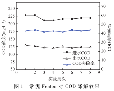 1)采用常規Fenton氧化法處理化工合成制藥廢水,處理效果往往不高,即使在最優運行工況下,一般COD去除率仍低于45 %