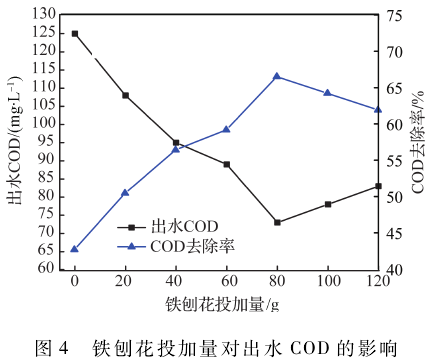用濃H2S04調節廢水pH = 3. 8,分別取800 mL廢水于6個1 L燒杯中,分別投加鐵刨花0、20、40、60 、80 、100和120 g, 30% H202投加量均為0. 6 mL / L ,曝氣反應時間為2h,研究不同鐵刨花投加量對Fenton氧化出水COD的影響,實驗結果見圖4。