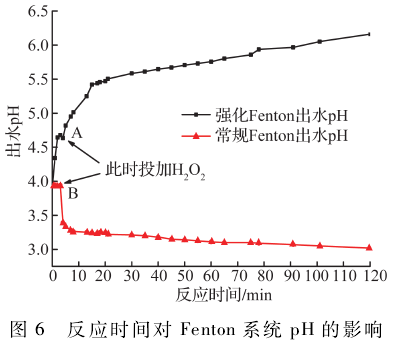 由圖6可知,常規Fenton初始pH為4. 00,投加FeS04 ·7H20后pH值基本沒有變化,僅從4. 00降低至3. 95;第3分鐘開始向系統中投加H202 0. 6mL / L ,如圖6中A點所示,發現其pH值在1 min內從3. 95快速下降至3. 39 ;5 min后常規Fenton出水pH值隨反應時間延長仍不斷下降但其降低速率減緩,2h出水pH降低至3. 02。強化Fenton初始pH值同樣為4. 00,在鐵刨花加人后pH值就開始升高,3 min 內 pH值從4. 00升高至4. 68;第3分鐘時向系統中投加H2O2 0. 6 mL / L,如圖6中B點所示,發現1 min內系統pH值略有下降(從4. 68降至4. 64 ),然后又繼續保持升高趨勢;此后強化Fenton系統pH值在15 min快速上漲,15 min后pH值仍繼續升高,但增長速度變慢,2h出水pH值升高至6. 16。