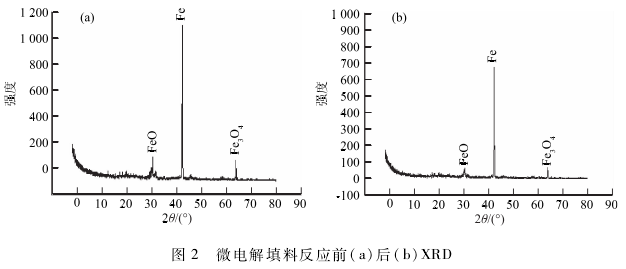 由圖1可知,反應(yīng)之后微電解填料膨脹性不明顯,表面沒有材料脫落的現(xiàn)象,證明在該條件下燒結(jié)的鐵碳微電解填料具有良好的結(jié)構(gòu)穩(wěn)定性。微電解填料反應(yīng)前后的XRD分析圖譜如圖2所示。
