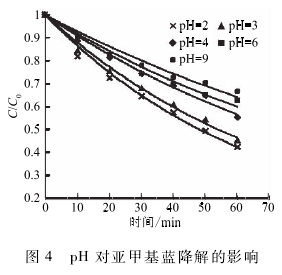 選取pH值為2、 3、 4 、6和9進(jìn)行實(shí)驗(yàn),所采用的亞甲基藍(lán)溶液濃度10 mg / L ,溶液體積200 mL,鐵碳微電解填料投加量為6 g(30 g / L ),反應(yīng)時(shí)間1 h,曝氣方式采用均勻不連續(xù)曝氣,曝氣量3 L / min,曝氣時(shí)間每10 min曝氣5 min。實(shí)驗(yàn)結(jié)果如圖4所示。