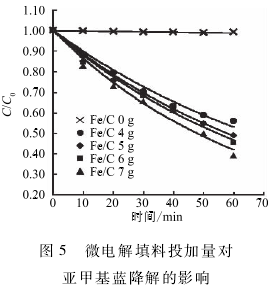 在不添加鐵碳材料的情況下,亞甲基藍(lán)基本不發(fā)生降解。當(dāng)填料的投加量依次采用4 ,5 ,6和7 g,所降解的亞甲基藍(lán)溶液濃度10 mg / L,溶液體積200 mL, pH值為3,反應(yīng)時(shí)間 1 h ,曝氣方式采用均勻不連續(xù)曝氣,曝氣量3 L / min ,曝氣時(shí)間每10 min曝氣5 min。實(shí)驗(yàn)結(jié)果如圖5所示。
