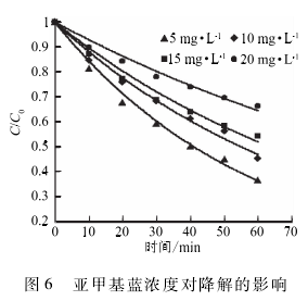 實(shí)驗(yàn)中設(shè)置的亞甲基藍(lán)濃度分別為5,10,15和20 mg / L,溶液體積200 mL , pH值為3,微電解填料投加量6g(30 g / L)反應(yīng)時(shí)間1 h,曝氣方式采用均勻不連續(xù)曝氣,曝氣量3 L / min,曝氣時(shí)間每10 min曝氣5 min。實(shí)驗(yàn)結(jié)果如圖6所示。