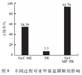 圖8中Fe/C ME代表微電解過程,PR代表單獨(dú)過氧化氫的過氧化過程,F(xiàn)e/C ME一PR代表微電解與芬頓效益聯(lián)用過程。從圖8可以明顯看出,亞甲基藍(lán)的去除率在兩個(gè)效應(yīng)聯(lián)用之后增加顯著,具體原因可以從芬頓反應(yīng)的原理見式(1)-(4)。