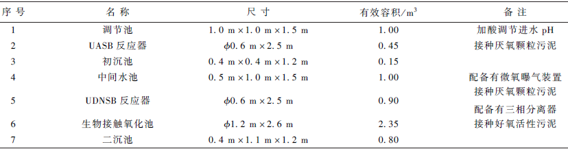 上流式厭氧污泥床(UASB)反應器是第二代廢水厭氧處理反應器,能利用厭氧微生物有效降解廢水中的大部分有機物并提高廢水的可生化性,具有結構緊湊、能耗低、處理負荷高、抗沖擊性好、產泥量少和產氣可資源化利用等優點 ;上流式反硝化污泥床(UDNSB)因其顆粒污泥沉降性能好,反應器污泥濃度高,從而可承受較高的處理負荷,并獲得良好的脫氮效果和穩定的出水水質,同時還可以大幅節省沉淀分離空間,是一種有廣泛應用前景的脫氮工藝,但目前在制革廢水處理方面相關的研究報導還比較少。另外,采用UDNSB 反應器與生物接觸氧化池的組合系統對制革廢水進行脫氮處理時,無需污泥回流裝置,不同的污泥處于各自的反應系統內,反硝化與硝化獨立進行,可以避免相互影響。針對制革廢水的特點及其傳統處理工藝中存在的問題,本研究結合上述反應器的優點,設計了以UASB、UDNSB 和生物接觸氧化池為代表的生物處理組合工藝,開展了近1 年的現場中試,考察了該工藝對實際制革廢水COD、NH4+ -N 和TN 的處理效果。