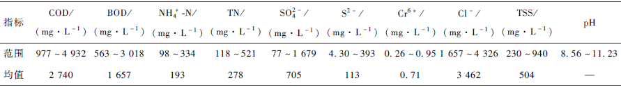 分析項目包括:COD、BOD5 、NH4+ -N、TN、VFA、Cr6 + 、Cl - 、pH 和DO 等,其中COD 的測定采用重鉻酸鉀法(水樣在測定前通入空氣使硫化物氧化以避免水中硫化物對測定結果的干擾),VFA 的測定采用蒸餾滴定法,pH 采用METTLER TOLEDO FE-20 pH 計測定,DO 采用OHAUS STARTER 300D 便攜式溶解氧儀測定,其他項目(BOD5 、NH4+ -N、TN、Cr6 + 和Cl - 等)則分別采用國家標準方法(稀釋接種法、納氏試劑分光光度法、堿性過硫酸鉀紫外分光光度法、二苯碳酰二肼分光光度法和硝酸銀滴定法等)進行測定。