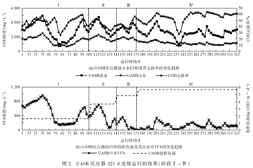 UASB 反應器在Ⅰ(1 ~ 102 d)、Ⅱ(103 ~ 141 d)、Ⅲ(142 ~ 174 d)和Ⅳ(175 ~ 321 d)4 個階段的運行中,進水量從250 L·d - 1 逐漸增加到1 000 L·d - 1 ,其HRT 則從43 h 縮短到11 h,平均容積負荷由1. 60 kg COD·(m3 ·d) - 1 提高到5. 63 kg COD·(m3 ·d) - 1 。