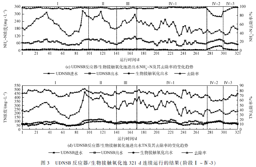 分析認為,由于HRT 的縮短及氨氮負荷的提高,生物接觸氧化池中的NH4+ -N 未能充分經過硝化作用氧化為NO2- -N 和NO3- -N,造成出水NH4+ -N 濃度升高,而NO2- -N 和NO3- -N 的濃度下降,進而限制了UDNSB 反應器反硝化作用的脫氮效率,最終導致出水TN 去除率顯著下降。在Ⅳ-3 階段,當UDNSB 反應器和生物接觸氧化池的HRT 再次調整到22 h 和57 h 時,反硝化/ 硝化段的處理效果逐步恢復到Ⅳ-2 階段的水平,其出水COD、TN 和NH4+ -N 的平均濃度分別為172、69. 1 和7. 2 mg·L - 1 。