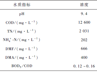 實驗中COD、NH4+ -N 和TN 按第4 版《水和廢水監測分析方法》測定 。COD 采用重鉻酸鉀法測定;TN 采用堿性過硫酸鉀消解紫外分光光度法;NH4+ -N 用納氏試劑比色法;DMF 采用分光光度法;DMA 采用HCl 滴定法。各監測指標均重復測3 次,取平均值作為最終的測定結果。