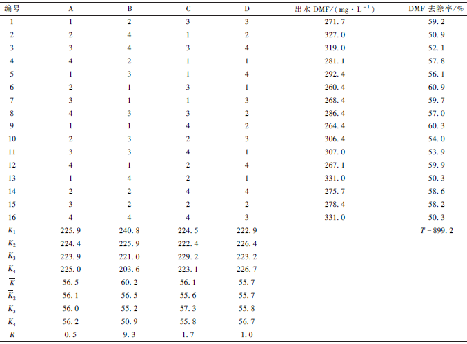 按L16(44 )正交表進行臭氧紫外催化氧化實驗,選取各因素水平如表2 所示。以DMF 為評價指標,正交實驗結果見表3。