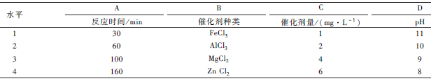 對該實驗進行極差分析,得到各個因素對臭氧氧化處理的效果的影響順序為:B > C > A > D,得出最佳參數條件為A2 B2 C3 D4 ,即當反應時間為60 min,選擇AlCl3 做催化劑,催化劑的投加量為4 g·L - 1 ,反應pH 為8 時,DMF 的去除率最高達到60. 9% ,出水DMF 含量在260 mg·L - 1 左右。