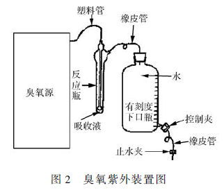 臭氧紫外處理技術是形成氧化性更強、反應選擇性較低的羥基自由基(其氧化還原電位2. 80 V)。本實驗在臭氧紫外氧化的基礎上外加均相的催化劑(AlCl3 、FeCl3 、MgCl2 和ZnCl2 ),旨在強化臭氧紫外的氧化能力以得到更高的處理效率。臭氧紫外氧化裝置采用的是臭氧殺菌分點測定UV + O3 系統,該裝置有效容積為800 mL。實驗時取臭氧流量為1 L·min - 1 ,紫外燈功率為30 W。臭氧紫外裝置見圖2。