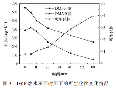 由圖2 可知,DMF 含量隨時間的增加呈逐漸下降趨勢,可生化性呈持續上升趨勢。但在0 ~ 10 min內廢水的可生化性并不是立即上升,而是在10 ~ 60min 才逐漸上升的。這是由于DMF 的分解產生了中間產物DMA 在短時間內未及時氧化,而DMA 的毒性又大于DMF 的毒性,隨著時間的延長DMA 逐漸被降解且DMA 的降解速度大于DMF 的分解速度,所以出現了上述情況。