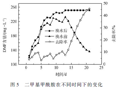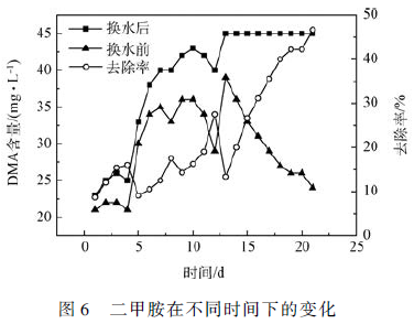 廢水中的DMA 主要由兩部分組成:一部分是廢水中含有一定的DMA,一部分是由廢水中的DMF 氧化分解而來,所以在臭氧催化氧化段會出現DMA 上升的情況,是由于DMF 分解的DMA 還未來得及氧化降解。經臭氧催化氧化DMA 已直觀降解了87. 5% ,生物處理部分由圖5 可知。DMA 的降解較DMF 的降解容易,一方面是由于DMA 的含量相對減少,另一方面DMA 也是由DMF 分解而來。由于廢水濃度的不斷變化引起DMA 的降解出現一定的波動,隨著時間的增加DMA 的降解呈穩定趨勢,出水含量僅有10 mg·L - 1 左右。具體參見污水寶商城資料或http://m.bnynw.com更多相關技術文檔。