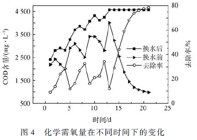 廢水中的污染物可通過臭氧氧化、微生物降解等形式去除,均相催化臭氧紫外氧化處理合成革廢水不僅提高了廢水的可生化性,而且流程簡單易控制,COD 的去除效果較顯著。厭氧(三階段理論)生化部分厭氧型微生物利用部分有機物質來充當碳源,經過水解發酵、產氫產乙酸和產甲烷等一系列反應。充分吸收污水中的有機營養物質來維持自身的新陳代謝,從而使有機物得到分解利用。由圖5 可知,生物處理效率隨著廢水濃度的增加而增大,這是因為微生物逐漸適應了該廢水,并能慢慢降解水中的COD,并且隨著廢水量的增加微生物的適應時間逐漸縮短。當反應器達到全負荷運行時微生物的降解能力開始大幅度提高,最后趨于穩定,說明微生物具有較強的抗沖擊負荷能力。經好氧處理后系統出水COD 去除率達到99. 6% , 含量在60 mg · L - 1以下。