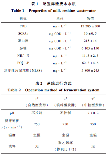 隨著生活水平的提高,乳制品的生產(chǎn)量逐年增大,導(dǎo)致乳業(yè)廢水的排放量也逐年增加。乳業(yè)廢水主要來源于牛乳輸送、加工過程中排放的洗滌水以及加工設(shè)備的沖刷水。廢水的主要成分是蛋白質(zhì)、乳糖、乳脂等。目前,乳業(yè)廢水常用處理方法是氣浮+ 厭氧+ 好氧工藝,氣浮階段產(chǎn)生大量的乳渣。據(jù)統(tǒng)計(jì),乳渣中含有大量的蛋白質(zhì)、糖類和脂肪等。因此,乳渣可作為原料生產(chǎn)精飼料,也可發(fā)酵生產(chǎn)氨基酸。乳渣廢水厭氧發(fā)酵過程與污泥厭氧發(fā)酵相似,大體可分為3 個(gè)階段,即水解、酸化和產(chǎn)甲烷 ,其中水解階段為大顆粒有機(jī)物在水解酶的作用下分解成可溶性小分子物質(zhì);酸化階段為產(chǎn)酸菌利用水解產(chǎn)物生成可揮發(fā)性脂肪酸(SCFAs);產(chǎn)甲烷階段則是產(chǎn)甲烷菌利用SCFAs 生成CH4 。因此,乳渣廢水厭氧發(fā)酵過程中微生物可將乳渣中的蛋白質(zhì)和多糖轉(zhuǎn)化為SCFAs。研究表明,利用SCFAs 合成聚羥基脂肪酸(PHA)成本可降低50% ,而且PHA 品質(zhì)大幅度提升 。SCFAs 也可作為碳源用于生物脫氮除磷,進(jìn)而節(jié)約污水處理廠運(yùn)行成本。發(fā)酵副產(chǎn)物NH4+ -N 和PO4^3- -P 可通過鳥糞石沉淀回收用于農(nóng)業(yè)生產(chǎn)。因此,乳渣廢水厭氧發(fā)酵產(chǎn)酸不僅能夠有效回收乳渣廢水中的資源和能源,還能使浮渣廢水得到有效的處理。目前乳渣廢水處理主要是自然型厭氧發(fā)酵產(chǎn)甲烷為主,厭氧發(fā)酵產(chǎn)酸研究甚少。發(fā)酵系統(tǒng)中投加填料,一方面增加廢水與微生物的反應(yīng)時(shí)間,同時(shí)填料表面能夠富集功能菌團(tuán),提高系統(tǒng)內(nèi)物種豐度。pH 不僅影響系統(tǒng)內(nèi)微生物活性,而且影響其運(yùn)行成本。因此,本文以乳渣廢水為研究對象,以提取SCFAs 為目的,采用自然型發(fā)酵、填料型發(fā)酵以及中性型發(fā)酵,探討不同厭氧發(fā)酵方式對乳渣廢水水解酸化性能及產(chǎn)酸性的影響。