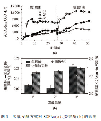 化學(xué)需氧量(COD)、懸浮污泥濃度(MLSS)及可揮發(fā)性污泥濃度(MLVSS)、NH4+ -N、PO4^3- -P 等根據(jù)標(biāo)準(zhǔn)方法測定。可揮發(fā)性脂肪酸(SCFAs)采用Agilent 6890 氣相色譜儀測定,色譜柱為DB-MAXETR(30 m × 530 μm × 1 μm),氮?dú)庾鲚d氣(N2 ),流速為25 mL·min - 1 ;檢測器為氫火焰離子檢測器(FID);進(jìn)樣口溫度為220 ℃ ;檢測器溫度控制在250 ℃ 。采用程序升溫,起始爐溫80 ℃ 運(yùn)行1 min,然后以20 ℃ ·min - 1 的速度升溫到160 ℃ ,運(yùn)行1 min,最后以5 ℃ ·min - 1 的速度升溫到180 ℃ ,運(yùn)行2 min,一個(gè)樣品的整個(gè)運(yùn)行時(shí)間為20 min。進(jìn)樣量為2. 0 μL,每個(gè)樣品測定3 次,取平均值進(jìn)行分析。分析各種酸成分并換算成COD,乙酸(∗1. 07)、丙酸(∗1. 51)、異丁酸(∗1. 82)、正丁酸(∗1. 82)、異戊酸(∗2. 04)及正戊酸(∗2. 04)。多糖采用硫酸-蒽酮分光光光度法測定,蛋白質(zhì)采用Lowry-folin 試劑分光光度法測定 。蛋白酶采用偶氮酪蛋白分光光度計(jì)方法測定。α-葡萄糖苷酶采用對硝基-a-d-吡喃葡萄糖苷分光光度計(jì)法測定 。輔酶420 采用異丙醇提取法測定。pH 采用oxi/340i WTW 測定。