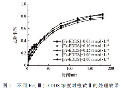 在pH = 7. 0,Na2 SO3 的投加量為1 mmol·L - 1 ,橙黃Ⅱ的濃度為10 mg· L - 1 條件下,反應時間為180 min,考察分別投加0. 05、0. 10、0. 25、1. 00 和2. 00 mmol·L - 1 的Fe(Ⅲ)-EDDS 配合物時,對橙黃Ⅱ降解率的影響(如圖1 所示)。