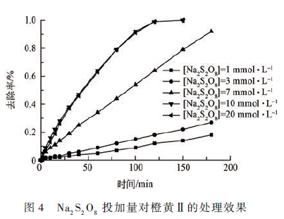 在pH = 7. 0, Fe ( Ⅲ )-EDDS 投加量為0. 50mmol·L - 1 ,橙黃Ⅱ的濃度為10 mg·L - 1 的條件下,反應時間為180 min,考察分別投加1、3、7、10 和20mmol·L - 1 濃度的Na2 S2 O8 時,對橙黃Ⅱ降解率的影響(如圖4 所示)。