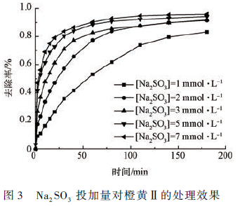在pH = 7. 0,Fe ( Ⅲ)-EDDS 的投加量為0. 05mmol·L - 1 ,橙黃Ⅱ的濃度為10 mg·L - 1 的條件下,反應時間為180 min,考察分別投加1、2、3、5 和7mmol·L - 1 濃度的Na2 SO3 時,對橙黃Ⅱ降解率的影響(如圖3 所示)。