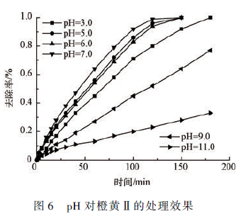 在Fe ( Ⅲ )-EDDS 濃度為0. 50 mmol · L - 1 ,Na2 S2 O8 濃度為10 mmol·L - 1 ,橙黃Ⅱ的濃度為10mg·L - 1 條件下,反應時間為180 min,分別考察pH為3. 0、5. 0、6. 0、7. 0、9. 0 和11. 0 時,對橙黃Ⅱ降解率的影響(如圖6 所示)。