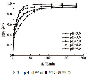 從實驗結果同樣可以看出,在pH = 3. 0 ~ 9. 0 的范圍內,該體系對橙黃Ⅱ的降解均可獲得較高的降解效率,經過60 min 的反應后所有體系中橙黃Ⅱ的去除率均超過80% ,由此可以認為該體系適用的pH范圍較廣,也克服了傳統Fenton 體系受環境pH 限制使用范圍的缺陷。