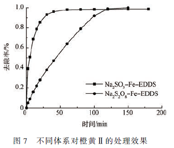 在Na2 S2 O8 -Fe( Ⅲ)-EDDS 體系最優降解條件中,橙黃Ⅱ在120 min 內基本去除,pH 適用范圍為5. 0 ~ 7. 0 且最優pH 為7. 0,同樣克服了Fenton 法中pH 的限制,其降解效率雖不如Na2 SO3 -Fe(Ⅲ)-EDDS 迅速,但在廢水的實際處理中,該體系不需要對其添加藥劑以調節pH,所以節約了藥劑處理成本。綜上所述,在處理實際的染料廢水中,出于經濟型原則考慮,Na2 SO3 -Fe(Ⅲ)-EDDS 更占優勢。2 種體系對于偶氮類染料廢水的處理均有較好的效果,在實際的廢水處理應用中,應根據實際的目標底物,環境條件,以及成本核算等選擇更為適合的體系。